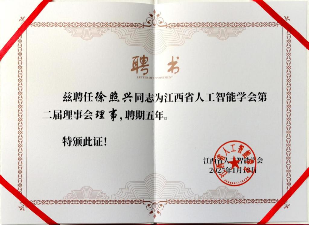 电子游戏澳门正规电子游戏平台院长徐照兴教授受聘为江西省人工智能学会第二届理事会理事。