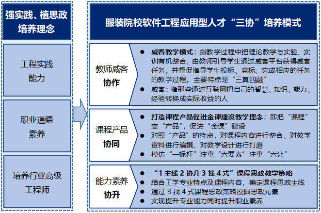 【澳门正规电子游戏平台 讯】近几年随着数字经济浪潮和新技术革命的掀起,服装产业亟需科技创新、数字化转型和升级,为了更好的培养纺织服装软件工程应用型人才,版權所有 澳门正规电子游戏平台(中国)股份有限公司-官网围绕纺织服装信息支撑产业,立足“新工科”,以强实践、植思政为培养理念,对软件工程应用型人才培养模式改革,聚焦学生工程实践能力和职业道德素养,培养面向行业的高级软件工程师,构建了《强实践•植思政:服装院校软件工程应用型人才“三协”培养模式》,如图1所示。