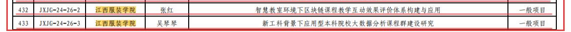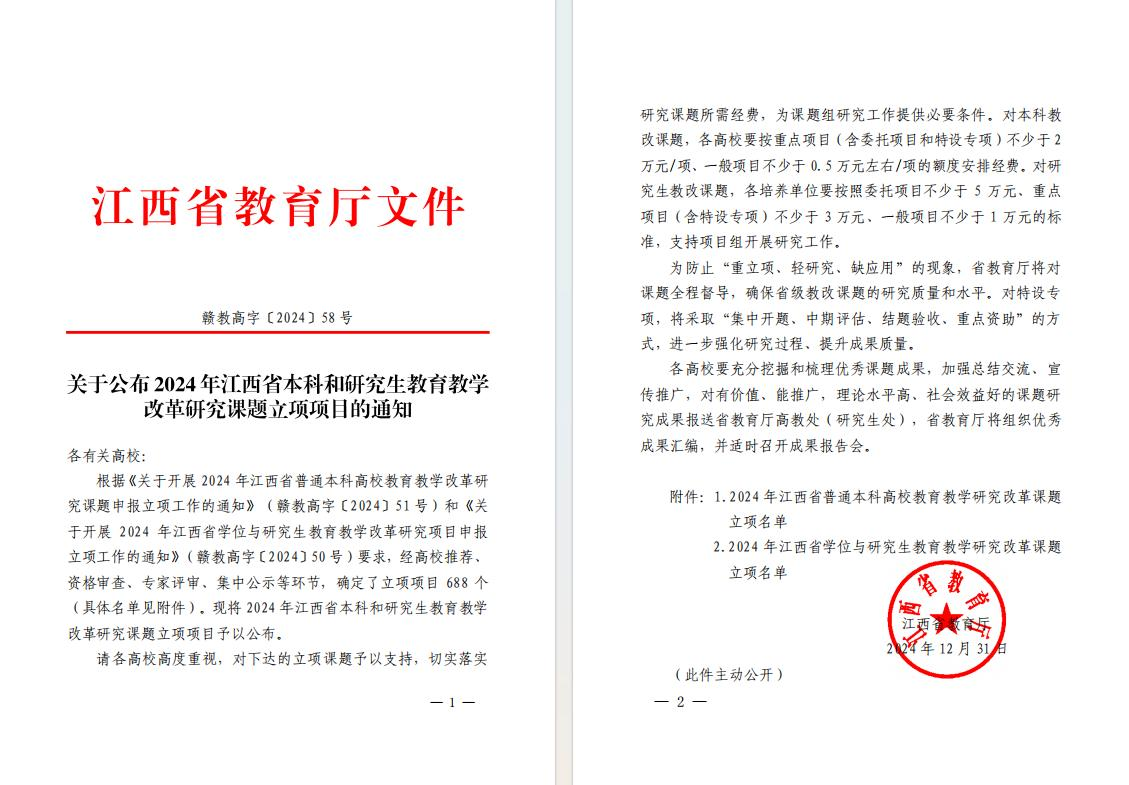 【澳门正规电子游戏平台讯】近日,江西省教育厅公布了2024年江西省普通本科高校教育教学研究改革课题立项名单,其中电子游戏吴琴琴、张红老师申报的教育教学改革研究课题项目获得立项。