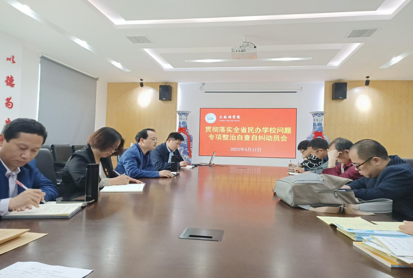 【澳门正规电子游戏平台 讯】为贯彻落实由江西省教育厅、江西省发展和改革委员会、江西省财政厅、江西省市场监督管理局四部门《全省民办学校问题专项整治实施方案》文件精神,电子游戏于2023年4月11日14时在学院会议室召开了专项整治自查自纠工作动员会,学院领导班子及全体教师参加了本次会议,会议由副院长赵德福主持。