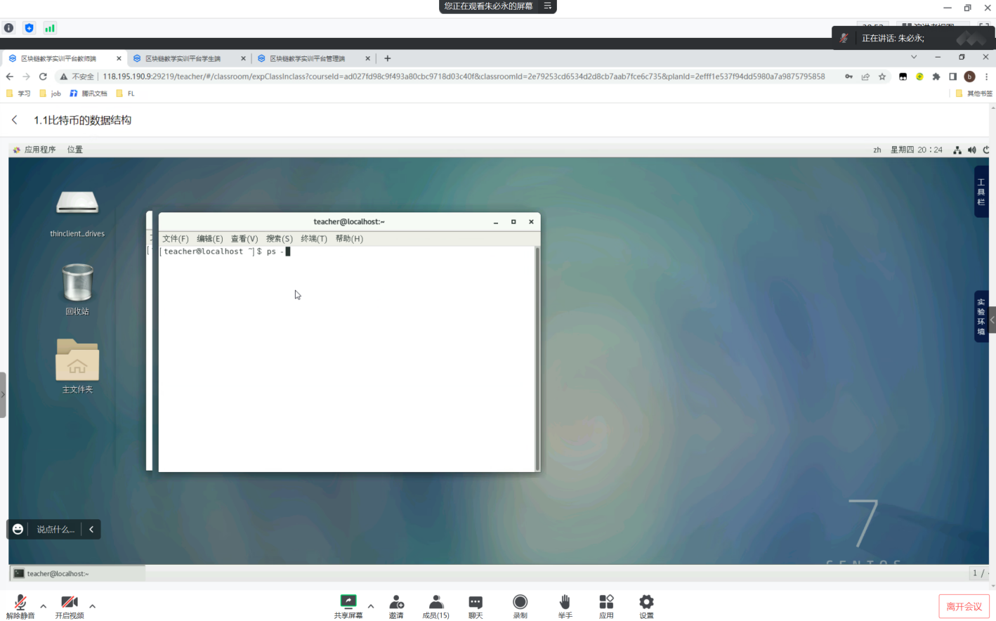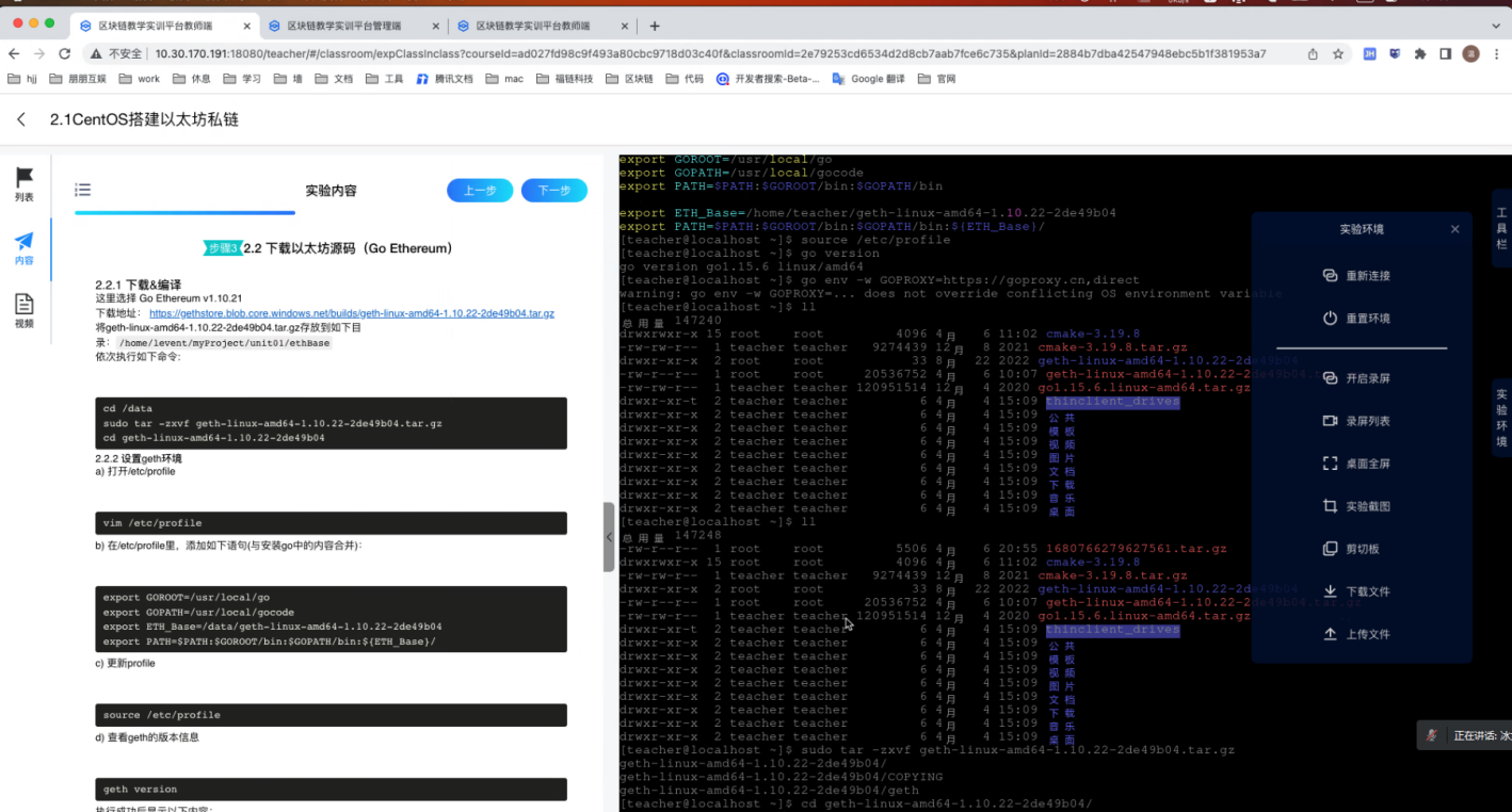 朱必永总经理首先详细介绍了区块链教学实训平台的三种用户端,分别为教师端、学生端和管理端,以及三种用户角色所拥有的功能和权限,并且重点演示了教师角色的权限和功能,接着介绍了区块链实训平台课程设计的计划表。