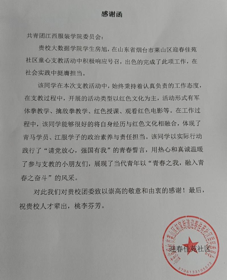 迎春佳苑社区对房旭同学致以童心支教的感谢信