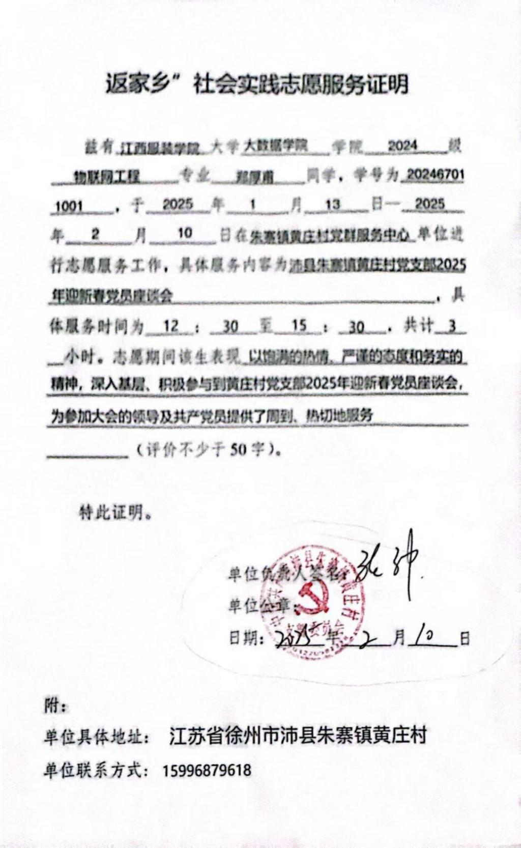 为了更有效地服务家乡,郑厚甫积极投身于多项丰富多彩的社会实践活动。在乡村教育支持活动中,他根据孩子们的学习进度和薄弱环节,制定个性化辅导方案,耐心讲解知识要点,帮助孩子们解决寒假作业中的难题,让孩子们的寒假时光充实而有意义。在助力乡村文化建设方面,他充分发挥自身创意与组织能力,积极参与春节迎春活动的策划。在送春联活动中,他邀请书法爱好者现场挥毫泼墨,一幅幅饱含新春祝福与美好寓意的春联在村民手中传递,为节日增添了浓厚的文化氛围。同时,他精心准备了各类生活物资和暖心礼品,与志愿者们一同走访慰问孤寡老人、残障人士等困难群体,为他们送去冬日里的温暖与关怀。