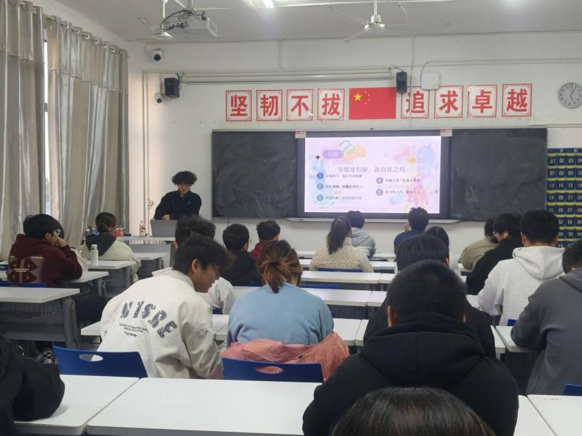 在交流分享环节,来自24数据科学本科4班的的胡满天同学以“情绪”为主题,带来了精彩的见解。胡满天同学指出,情绪如同我们内心的信号灯,每一种情绪都有其存在的价值。胡同学结合自身体验,阐述了如何从与情绪的“对抗”走向“对话”,并介绍了一些实用的情绪管理工具与练习方法,其“与情绪和解,方能奔赴真正的自我之约”的观点,引起了在场同学的深深共鸣。