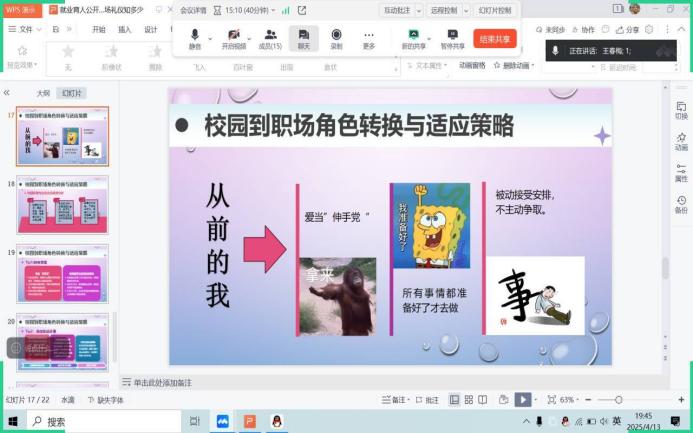 【澳门正规电子游戏平台讯】为帮助学生提前适应职场环境,提升职业素养与综合竞争力,版權所有 澳门正规电子游戏平台(中国)股份有限公司-官网于2025年4月13日晚通过线上平台举办了一场以“职场礼仪知多少”为主题的育人班会,面向即将开启工作生涯的毕业生,为他们的职业发展保驾护航。