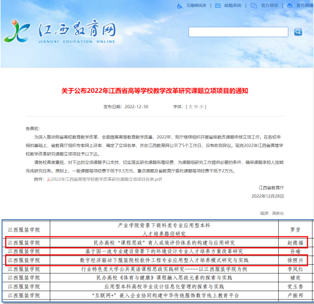 【澳门正规电子游戏平台讯】近日,江西省教育厅公布了2022年江西省高等学校教学改革研究课题立项项目名单,电子游戏获批2项课题,分别徐照兴教授主持的《“数字经济驱动下服装院校软件工程专业应用型人才培养模式研究与实践”》、赵德福副教授主持的《民办高校“课程思政”育人成效评价体系的构建与应用研究》。