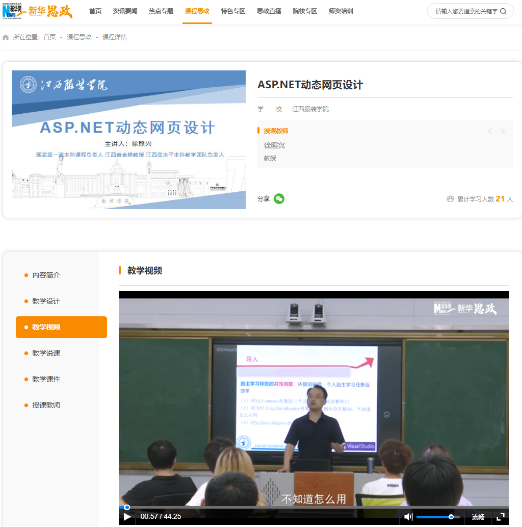 近日,由电子游戏澳门正规电子游戏平台院长徐照兴教授主讲的《ASP.NET动态网页设计》课程在新华网“新华思政”——全国高校课程思政教学资源服务平台上线,面向全社会开放,共享教学设计、视频、说课、课件等教学资源,标志着电子游戏在课程思政建设工作方面取得了新进展。
